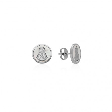 Pendientes Virgen del Rocío en formato redondo. Engastado con fondo en Nácar. Acabado pulido. Cierre a presión. Diámetro 11 mm.
