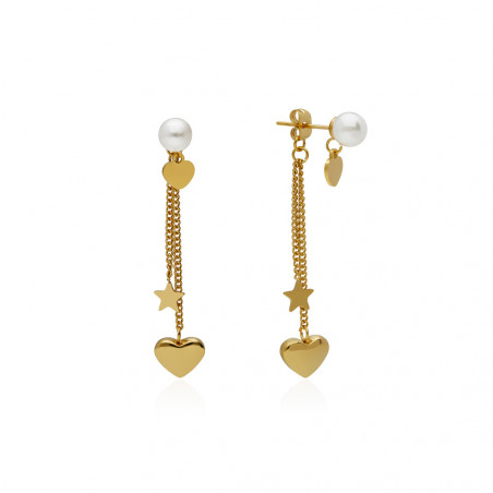 Pendientes Amore Perlas. Acero Dorado. Cierre Presión. Medidas 5 x 50 mm. Perlas 6 mm.